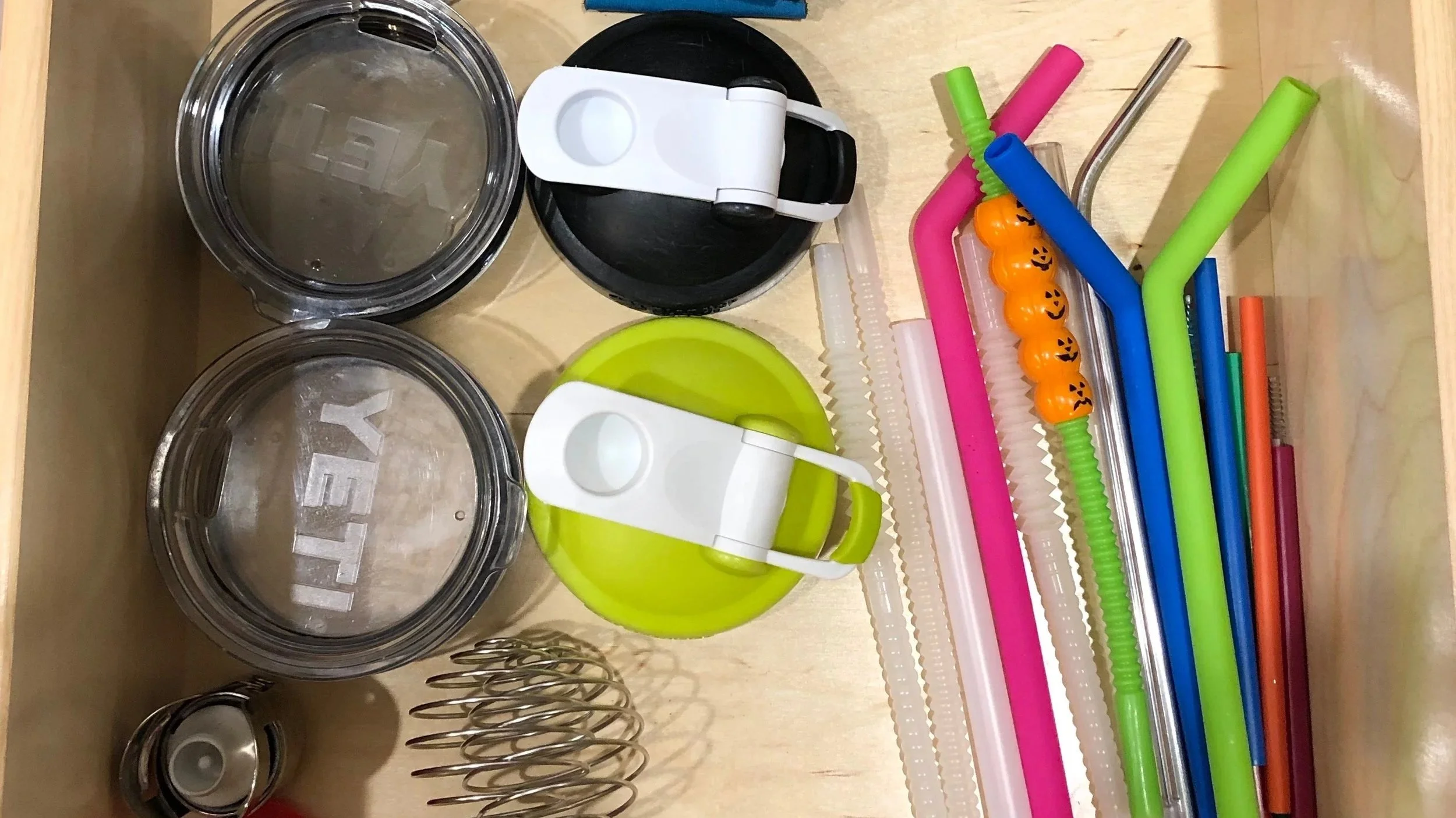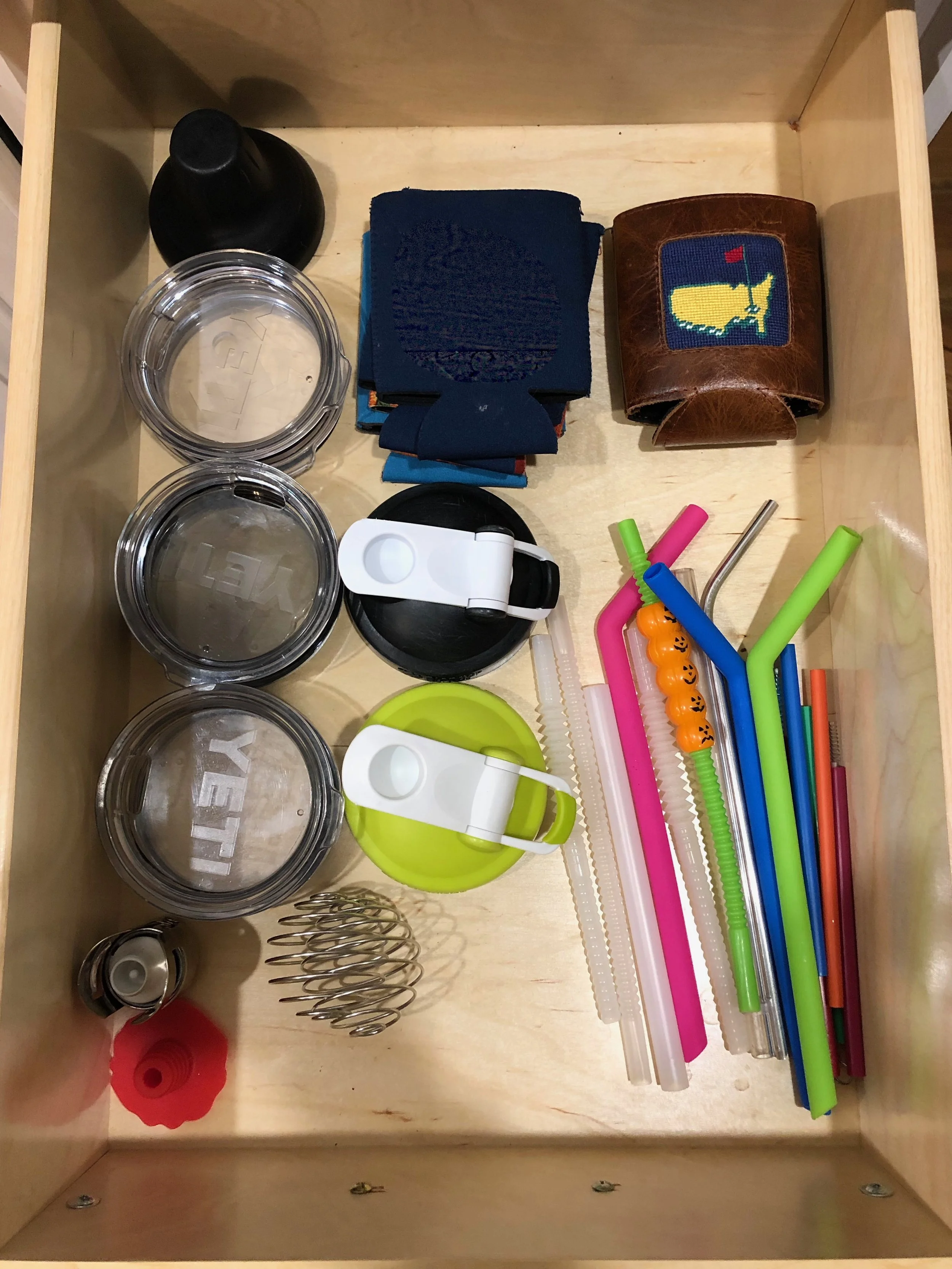 We were able to put lids together and straws together in a way that they will stay contained with space for the less used items in the back. Leaving everything easily in sight.